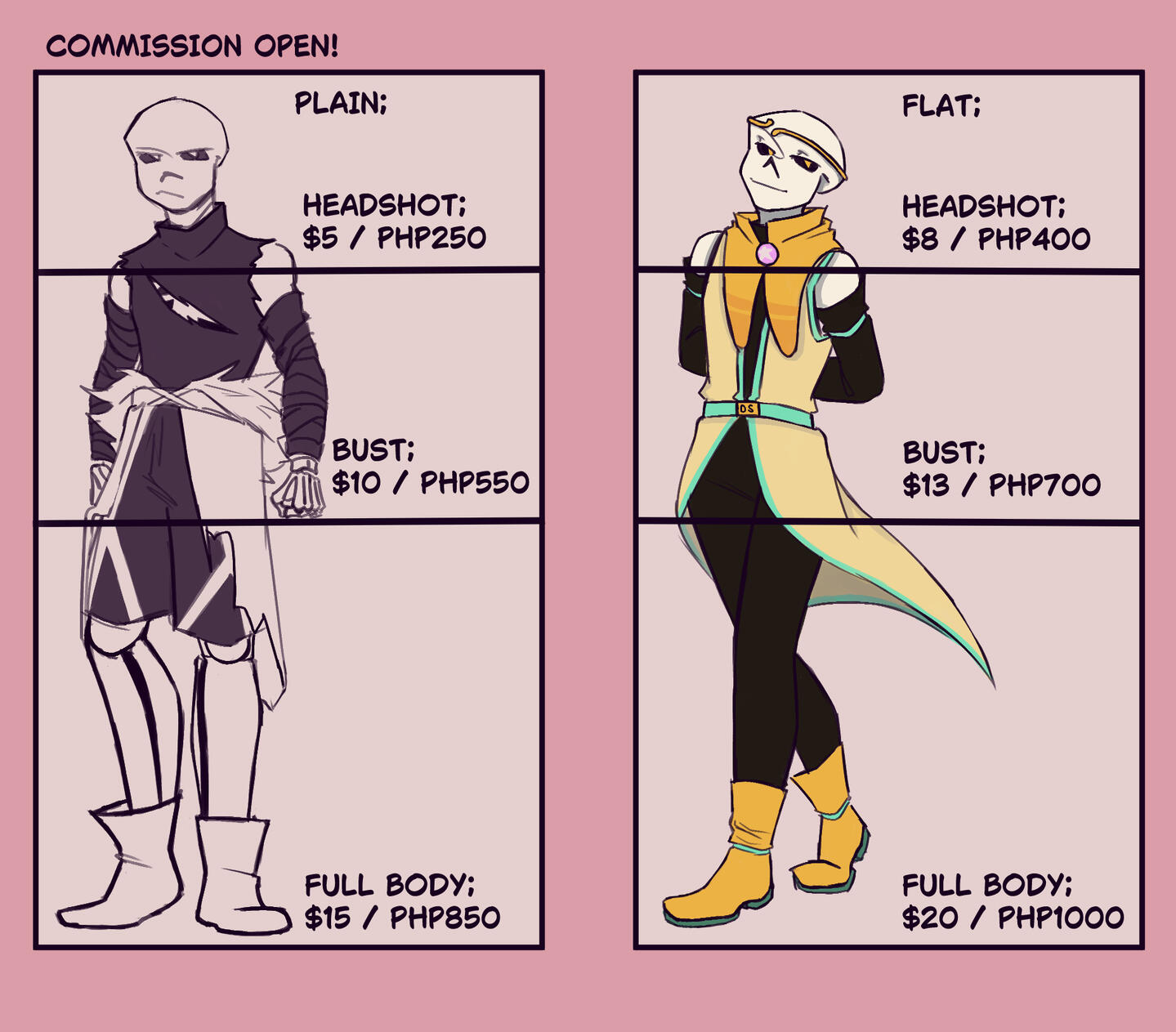 Plain:headshot - $5 / PHP250bust - $10 / PHP550full body - $15 / PHP850Flat:headshot - $8 / PHP400bust - $13 / PHP700full body - $20 / PHP1000