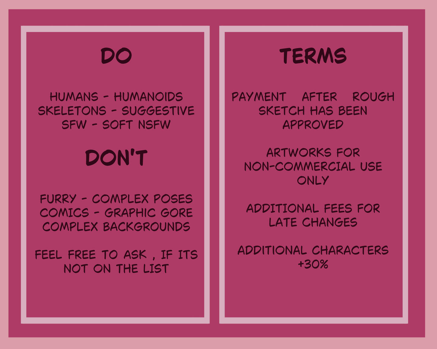 Plain:headshot - $5 / PHP250bust - $10 / PHP550full body - $15 / PHP850Flat:headshot - $8 / PHP400bust - $13 / PHP700full body - $20 / PHP1000